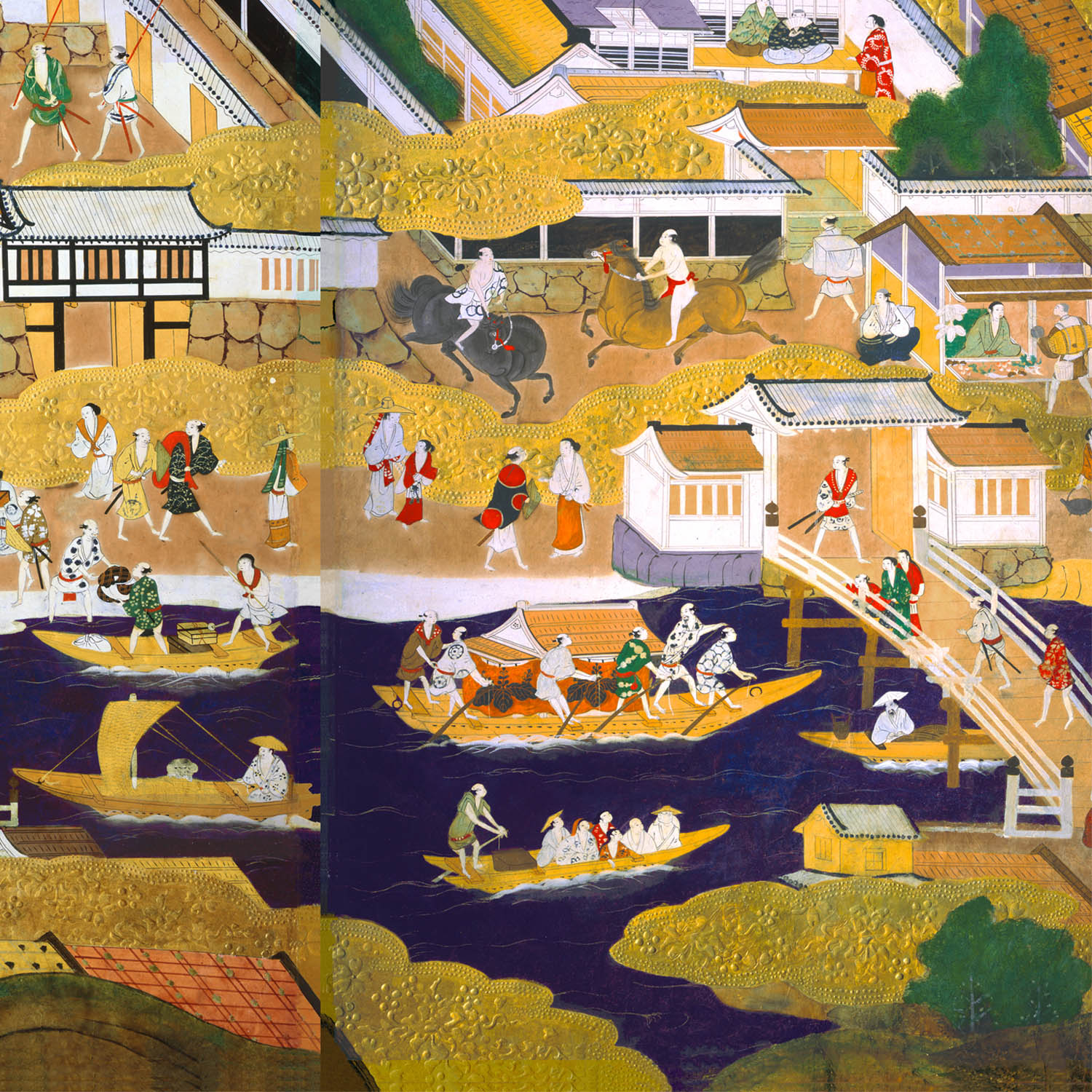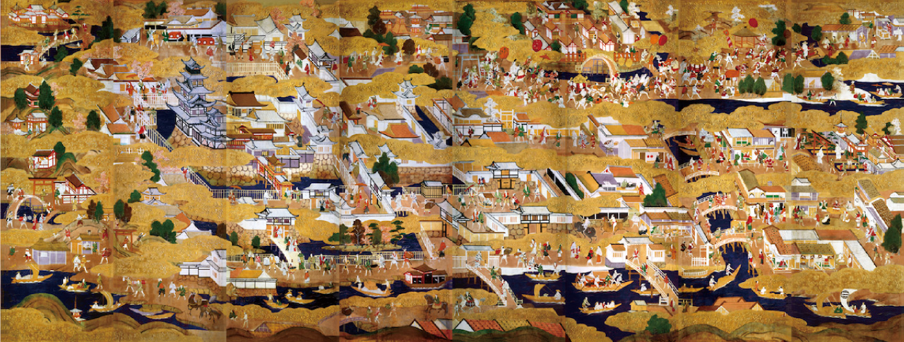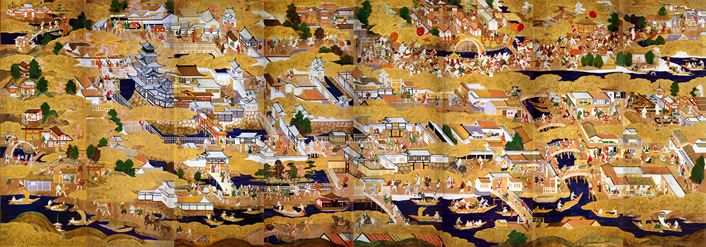 画面中央では、下の方に旧淀川(大川)が流れ、その向こうに大坂城と城下町が描かれています。 つまり、北から見た構図ということになります。 ただし、画面右上の住吉大社と四天王寺は西からの構図で描かれています。 また、画面左端の宇治平等院・石清水八幡宮・天王山は、本来なら大坂から大きく距離が離れた場面です。 これらは、屏風の限られた画面におさめるために、金雲で空間を処理するなどして描かれています。