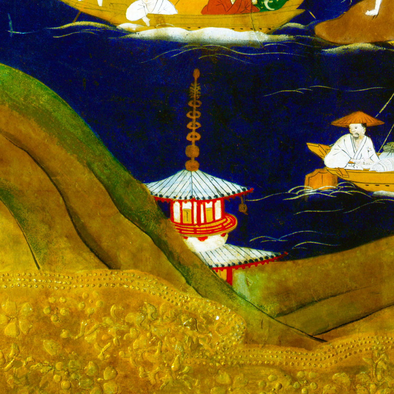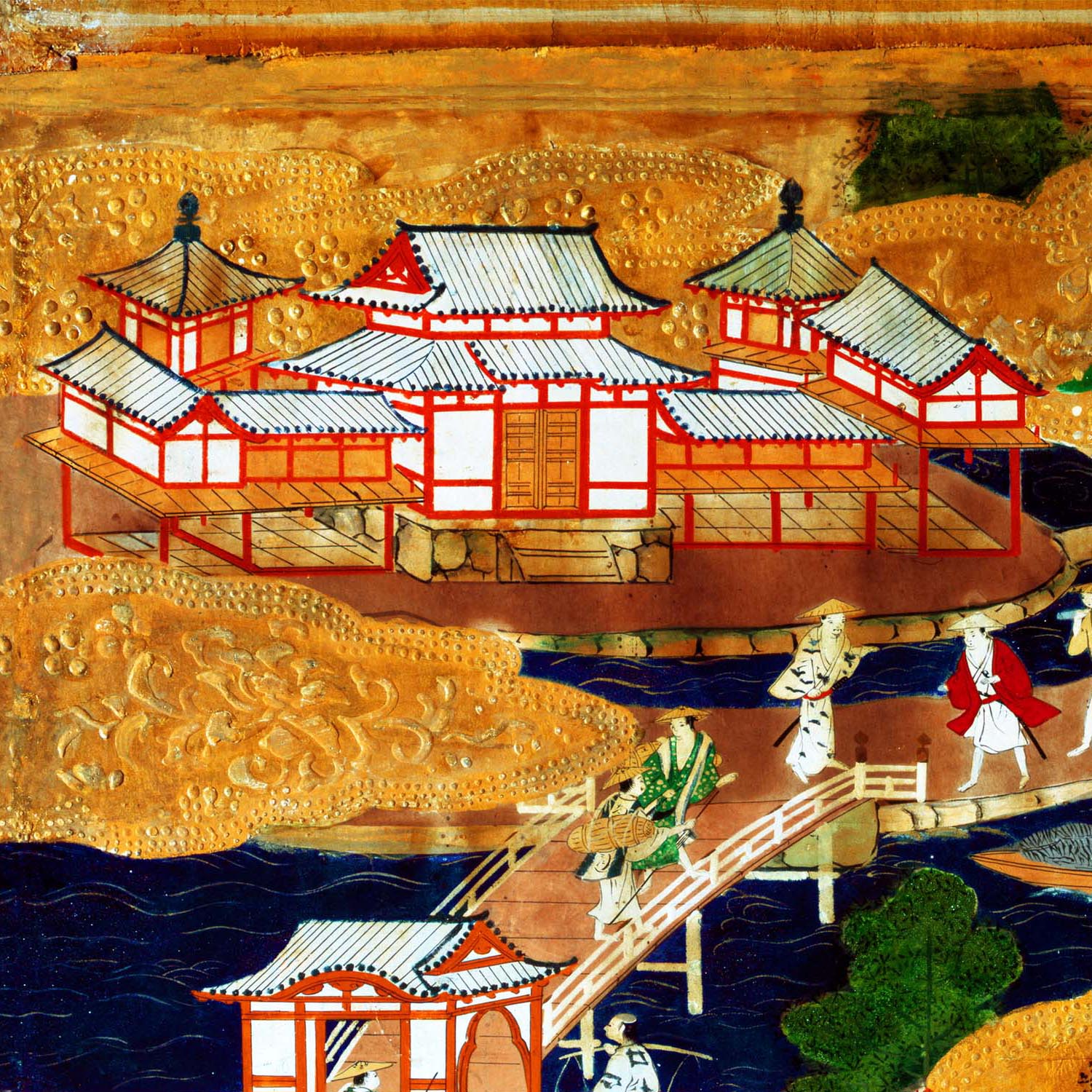 第八扇の最上段に、平等院鳳凰堂と宇治川が描かれています。宇治川には橋が架かり、柴を積んだ船が浮かんでいます。 「宇治の柴船」といえば、「新古今和歌集」に詠まれ、宇治川と柴船は宇治平等院を描くときに組み合わされる画題です。 (写真提供 平等院)