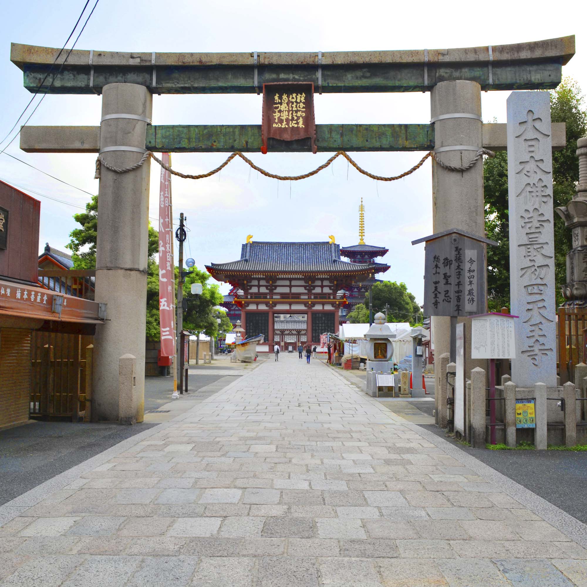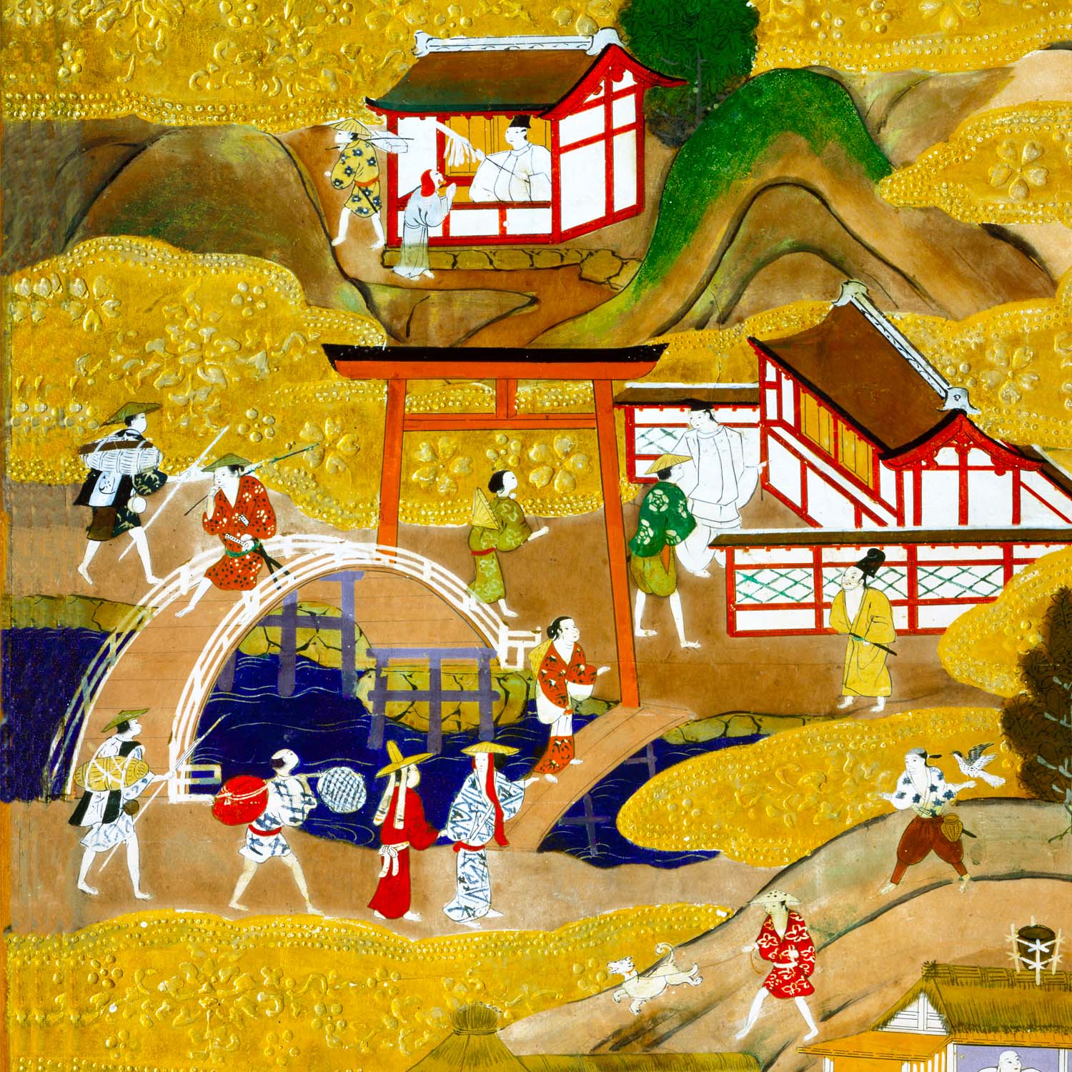 聖徳太子の建立と伝えられる四天王寺です。屏風では寺院の建物は簡略化され、石鳥居を象徴的に描いてあらわしています。 この石鳥居は、永仁2年(1294)に、四天王寺の別当であった忍性にんしょうによって建立されたものです。