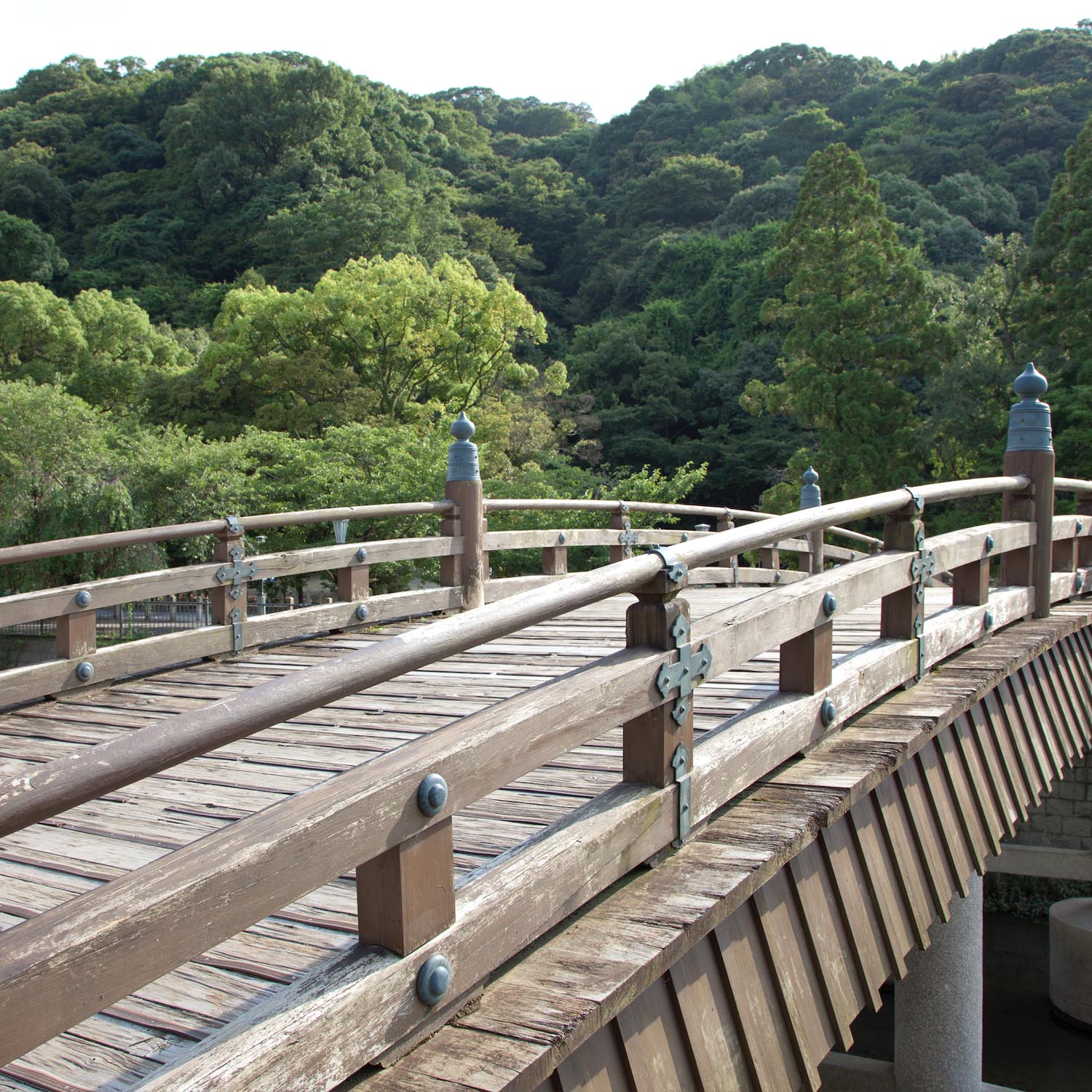 大坂から淀川をさかのぼっていくと、石清水八幡宮(現在の京都府八幡市)があります。石清水への参詣さんけいは、 放生川ほうじょうがわにかかる安居橋あんごばしをわたり、一の鳥居をくぐって山上の本殿へ向かいます。 「豊臣期大坂図屏風」の一番左端にあたる第八扇は、大坂を出て、京にはいるまでの名所が描かれています。