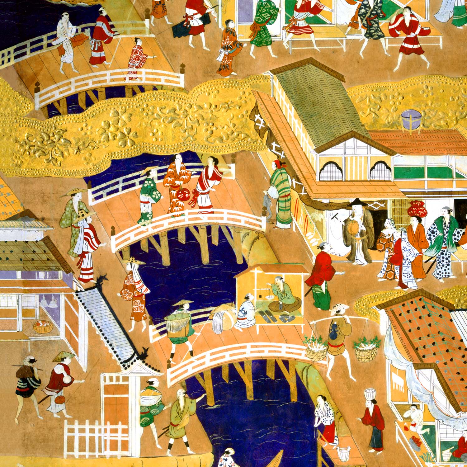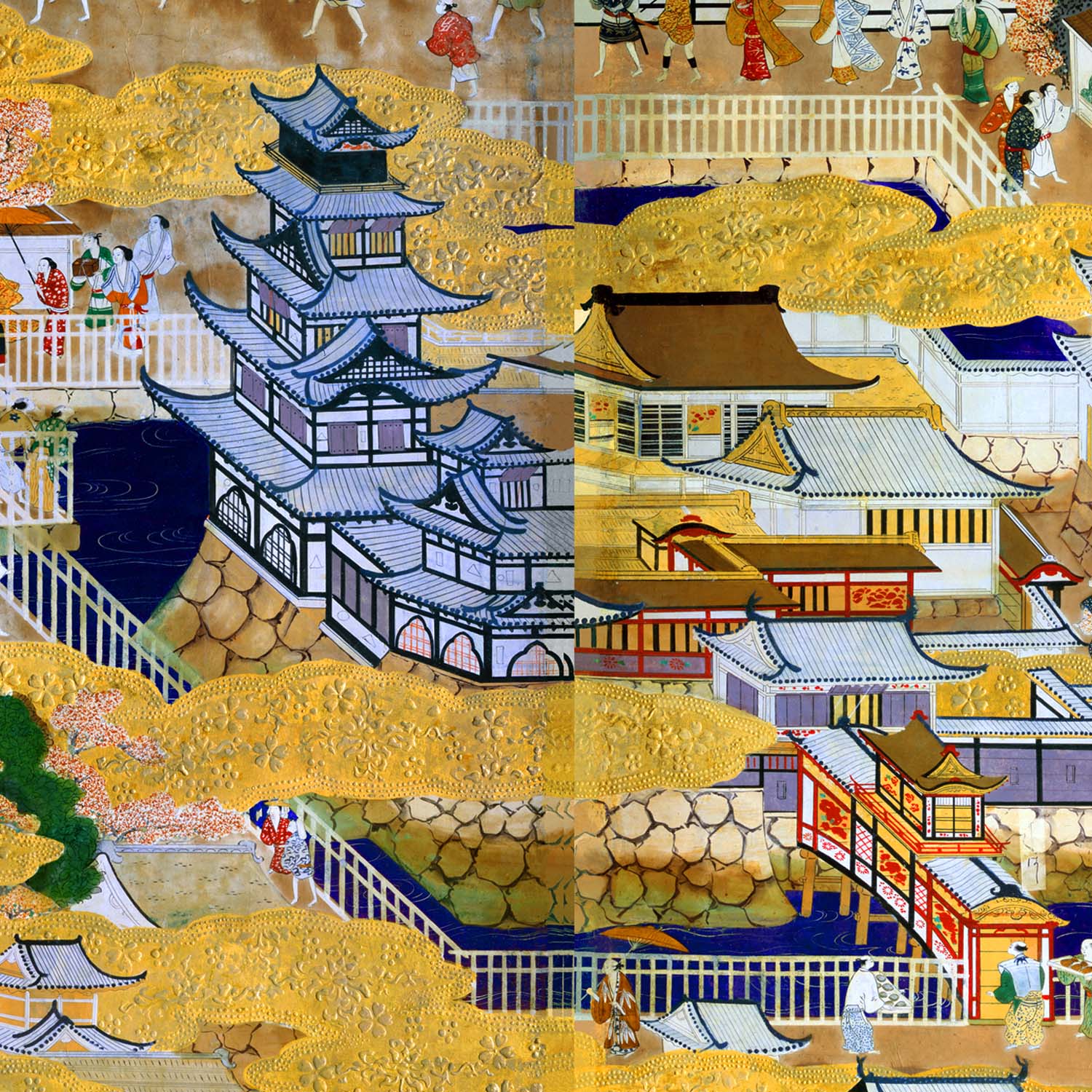 大坂城を象徴する五層の天守と廊下橋ろうかばし形式の極楽橋が描かれています。 天守は最上層に廻縁まわりえんと高欄こうらんを備えた「望楼式」ぼうろうしきとよばれる形式で、屏風に描かれている大坂城が豊臣期のものと判断する根拠となります。 極楽橋は花をかたどった文様で装飾されています。こうした大坂城の豪華な極楽橋は、当時日本に訪れたイエズス会宣教師の報告書に記録が見られます。