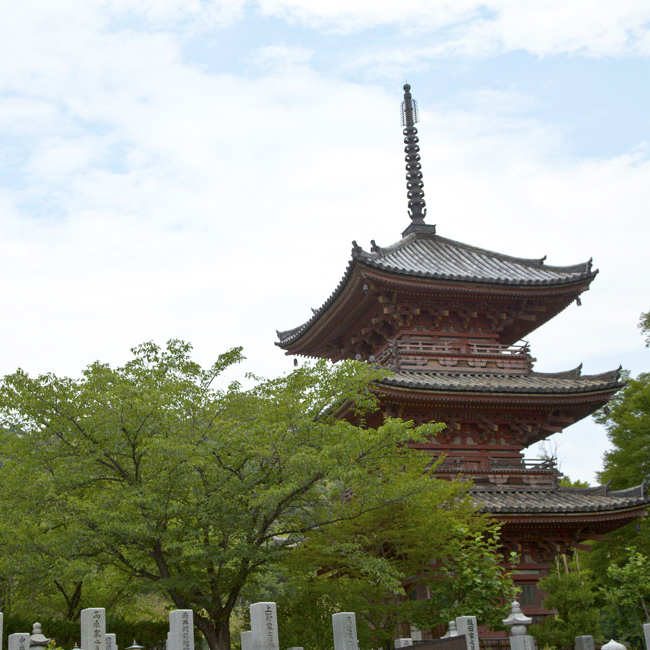 屏風の左端の山は、ひときわ高く描かれています。これは豊臣秀吉が明智光秀を破った合戦で有名な天王山をあらわしたものと考えられています。 山の麓ふもとには塔が描かれています。これは山崎の古刹、宝積寺ほうじゃくじの三重塔です。